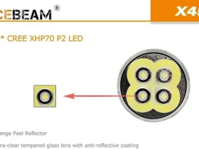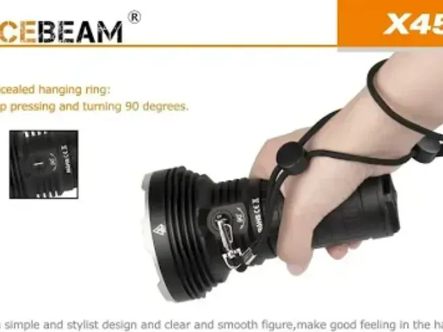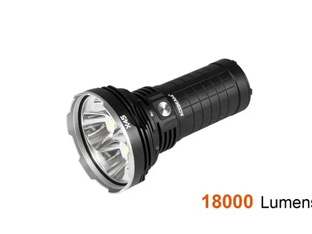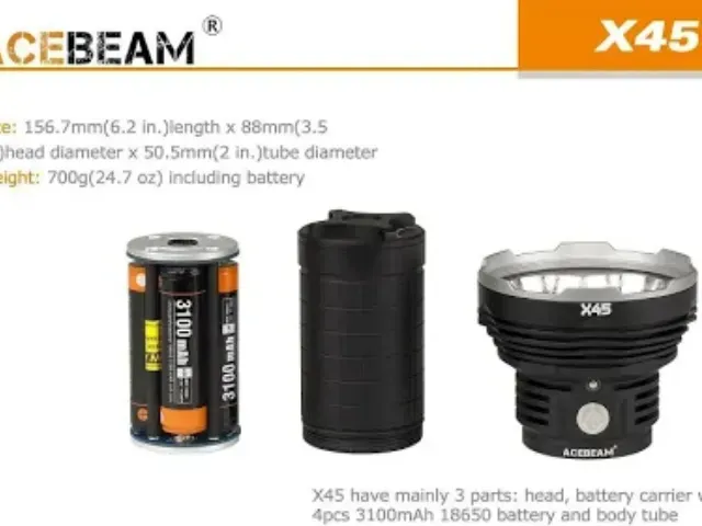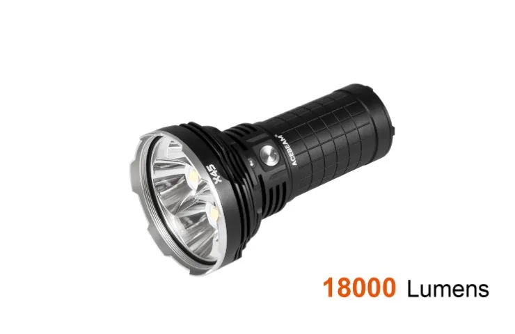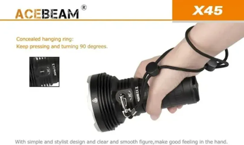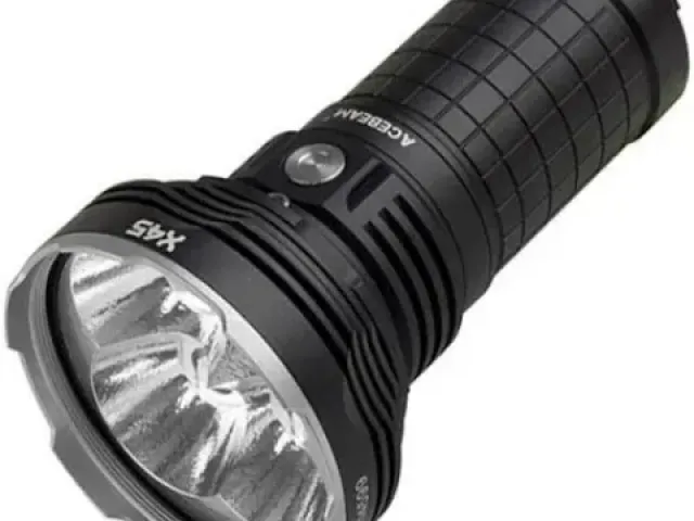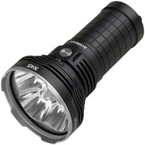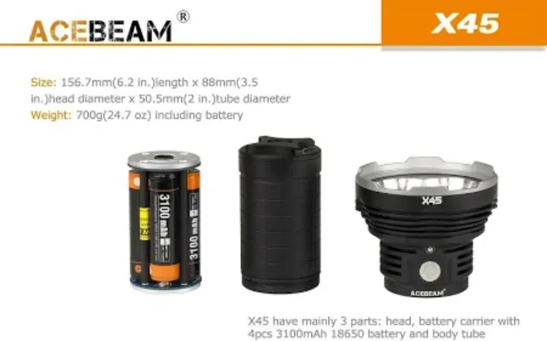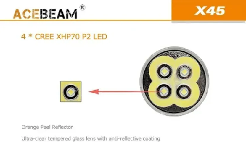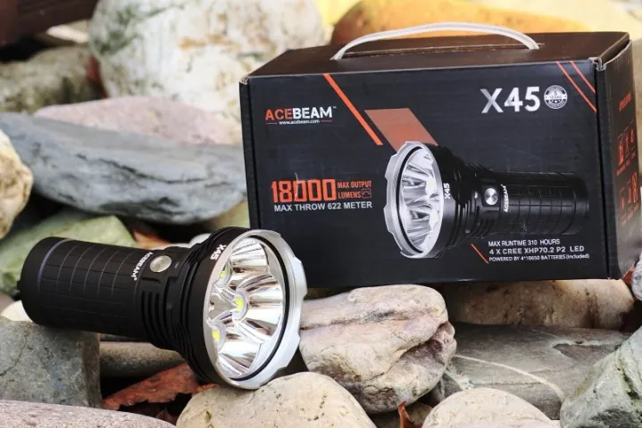 Acebeam-X45-6500K The flashlight features a Cree XHP70.2 LED with a lifespan of 50,000 hours. It has a maximum output of 18,000 lumens, with various modes offering different levels of brightness and runtime.