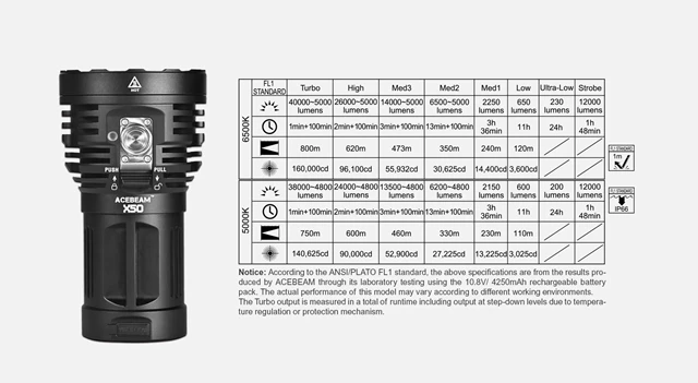 Additionally, the flashlight has a rechargeable battery that can be charged using the included USB-C cable. Overall, the Acebeam X50 2.0 6500k flashlight is an excellent choice for anyone who needs a bright, durable flashlight for outdoor activities.
