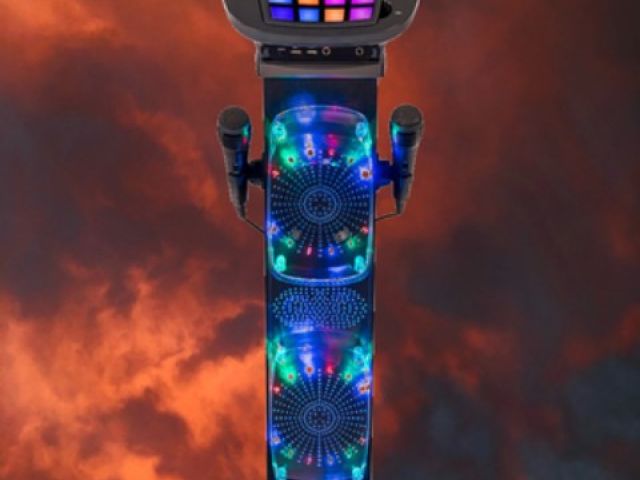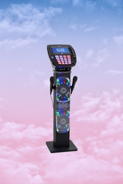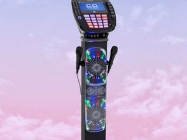 This karaoke machine is compatible with CD, CDG, CDR, CDRW, MP3, MP3G, and features 640W speakers.