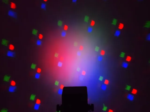 Vibrant RGB washes illuminate the space